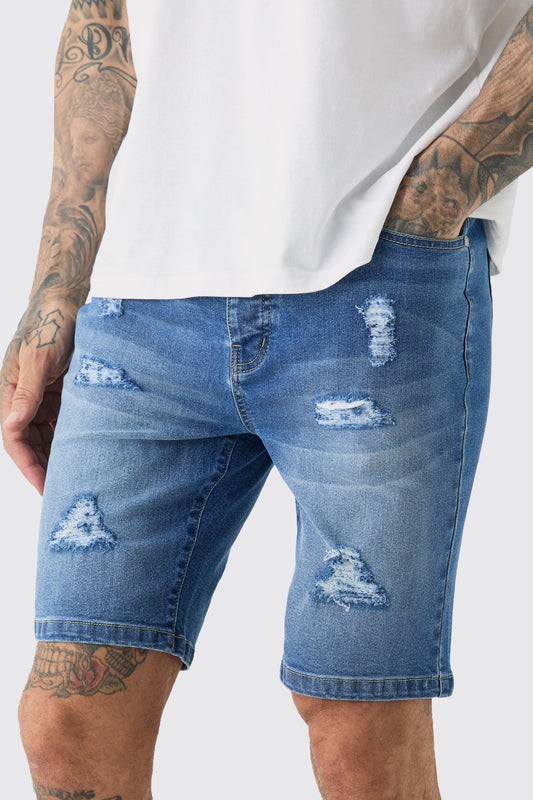 Boohoo distressed denim short in blue