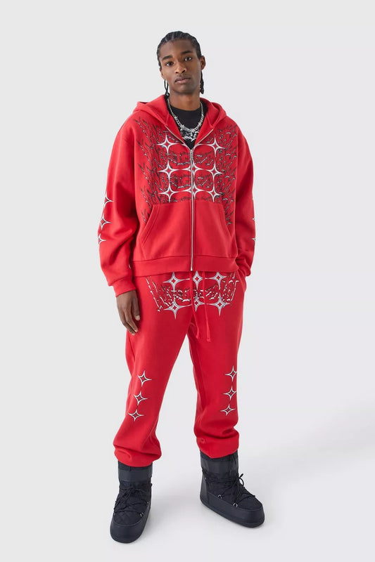 Boohoo tall oversized boxy grunge zip through ear hooded ear hooded tracksuit red
