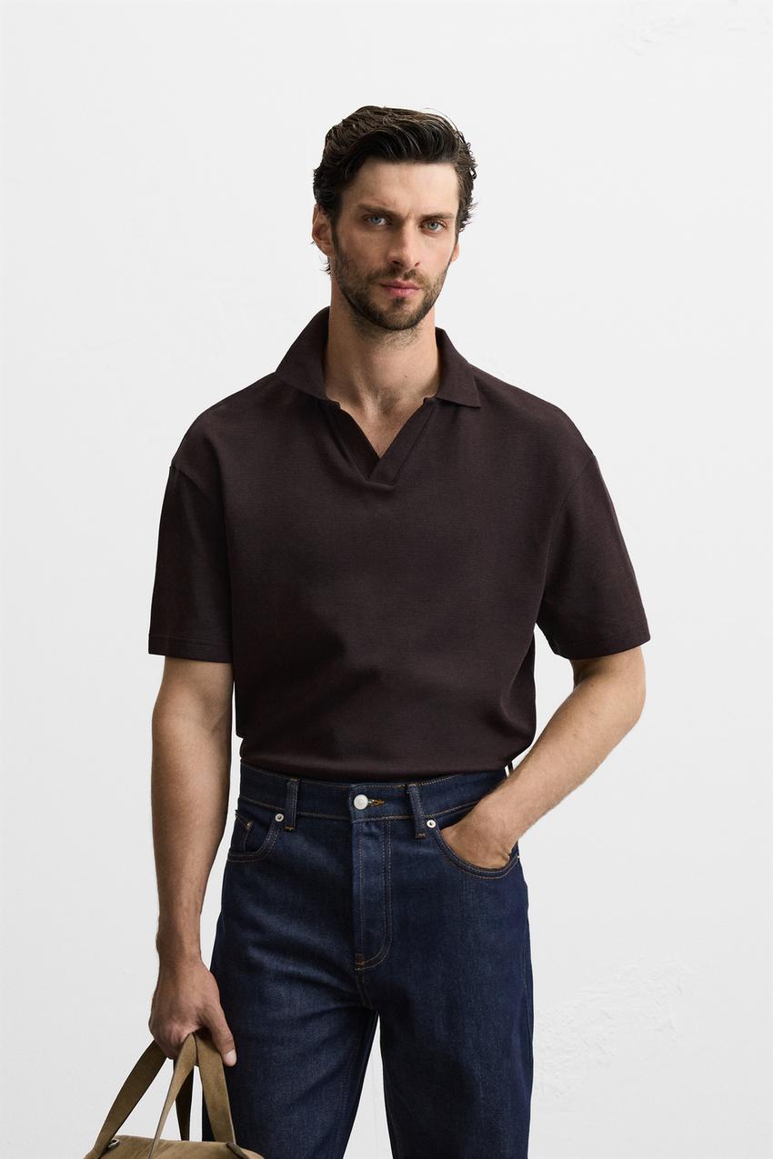 ZARA OPEN NECK GEOMETRIC JACQUARD POLO SHIRT